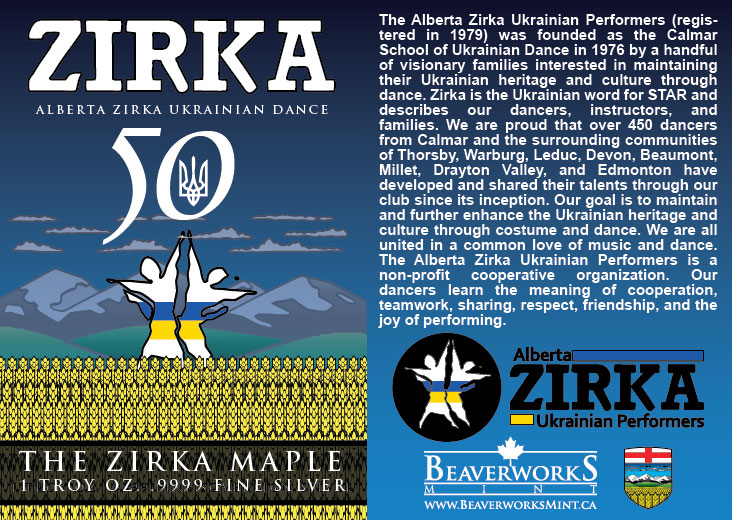 It was suggested that given how the family of the founder of Beaverworks Mint was one of the founding families of the Zirka Ukrainian Dance troop based out of Calmar, Alberta, that we make a concept fine silver maple coin as a potential fundraiser for them using some of our pre-existing dies. This way, they can celebrate Ukrainian Canadian dance expressed in silver. The status of this coin proceeding into production is still developing. Beaverworks produced all the the graphic designs based on their pre-existing published work to help “make it easy” for them as we aim to make things as “Turn-key” as possible for all projects and clients.